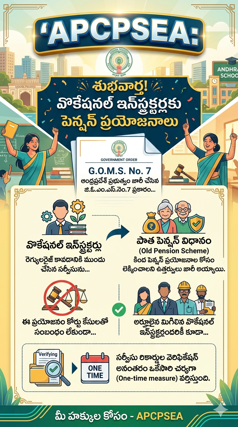 ఆంధ్రప్రదేశ్ ప్రభుత్వం జారీ చేసిన జి.ఓ.ఎం.ఎస్.నెం.7 ప్రకారం, వొకేషనల్ ఇన్స్ట్రక్టర్లు రెగ్యులరైజ్ కావడానికి ముందు చేసిన సర్వీసును పాత పెన్షన్ విధానం (Old Pension Scheme) కింద పెన్షన్ ప్రయోజనాల కోసం లెక్కించాలని ఉత్తర్వులు జారీ అయ్యాయి.