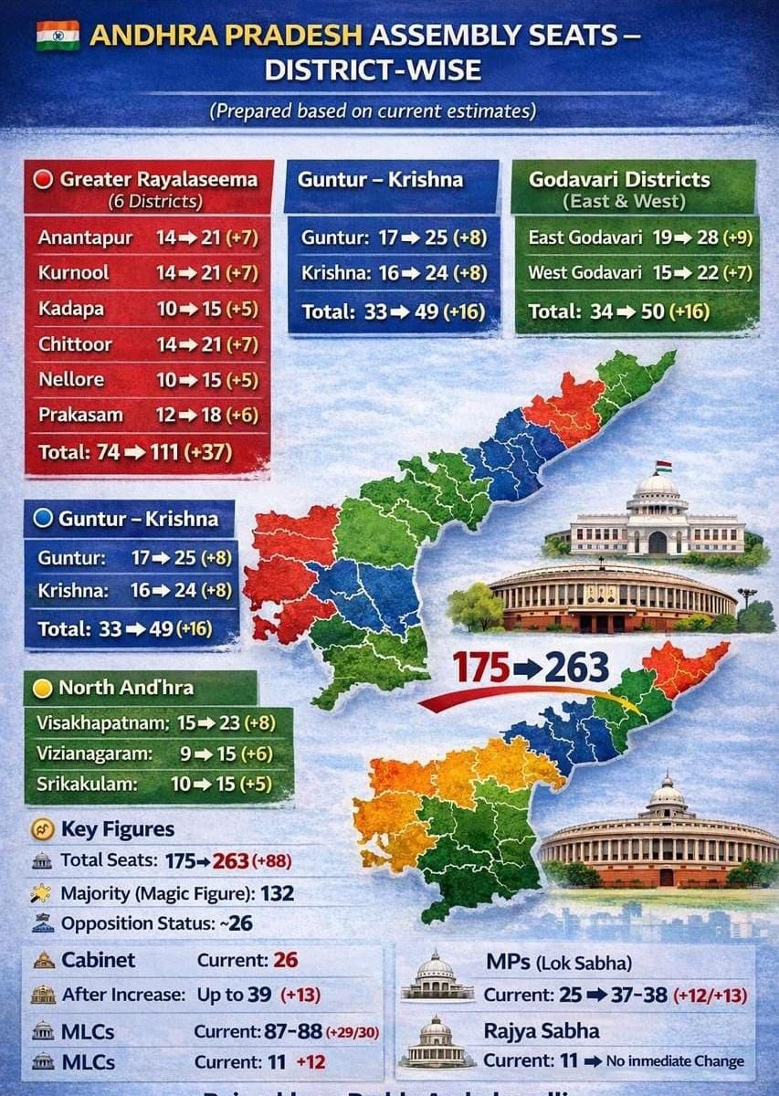 ఆంధ్రప్రదేశ్‌లో అసెంబ్లీ సీట్లు 175 నుంచి 263కి పెరుగుతూ మొత్తం 88 సీట్లు అదనంగా రానున్నాయి… ప్రభుత్వం ఏర్పాటు చేయాలంటే 132 సీట్లు అవసరం… మంత్రివర్గం, ఎమ్మెల్సీలు, ఎంపీ సీట్లు కూడా పెరిగే అవకాశం ఉంది…